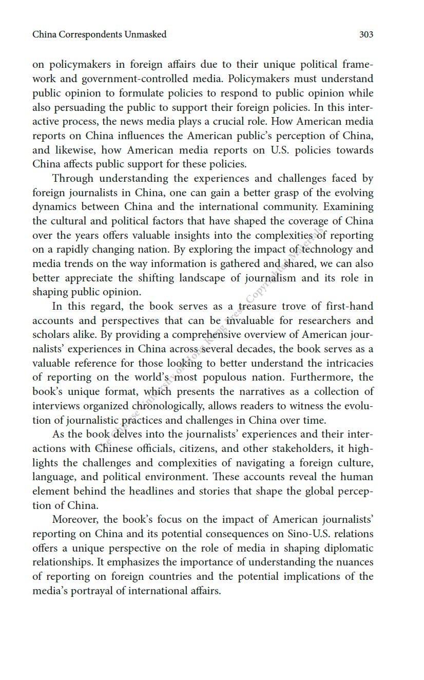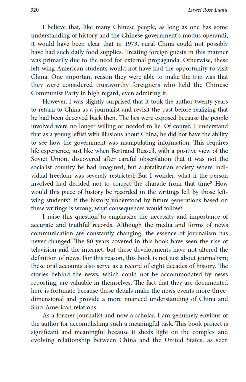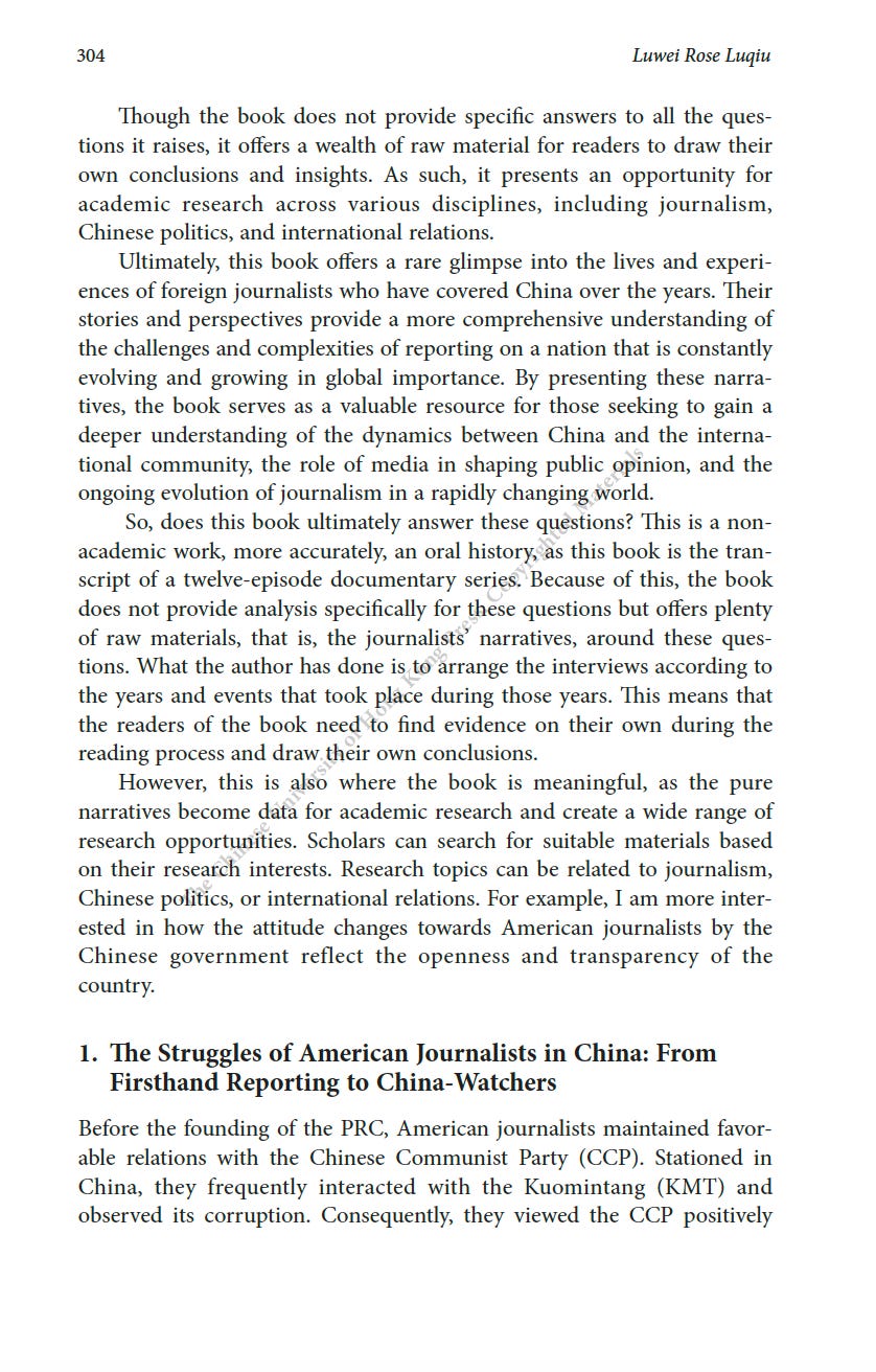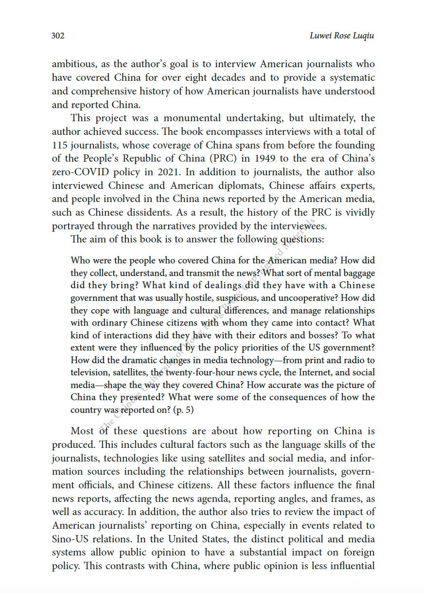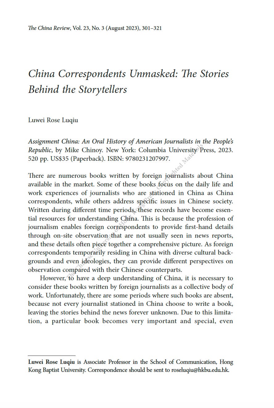 推薦一本書:美國駐華記者的口述歷史最近為China Review寫了一篇人生最長的書評,八千字。這本書是原CNN駐華記者Mike Chinoy花費了很長時間完成的一個project,採訪了超過一百名美國駐華記者,從採訪國共內戰的記者開始,一直到2021年採訪清零政策。其實我很羨慕他,可以有時間和精力完成這樣的一部口述歷史,因為不僅僅可以從講述中看中國的變化,也是美國新聞史研究的重要一手資料。閭丘露薇 Rose LuqiuSep 06, 2023171ShareThanks for reading 閭丘露薇’s Substack! Subscribe for free to receive new posts and support my work.Subscribe