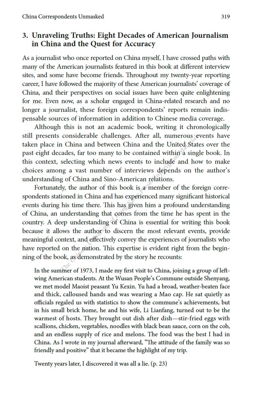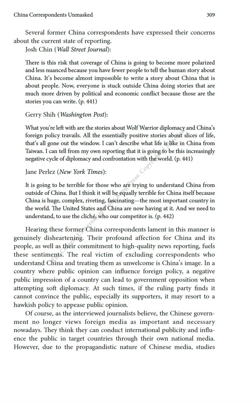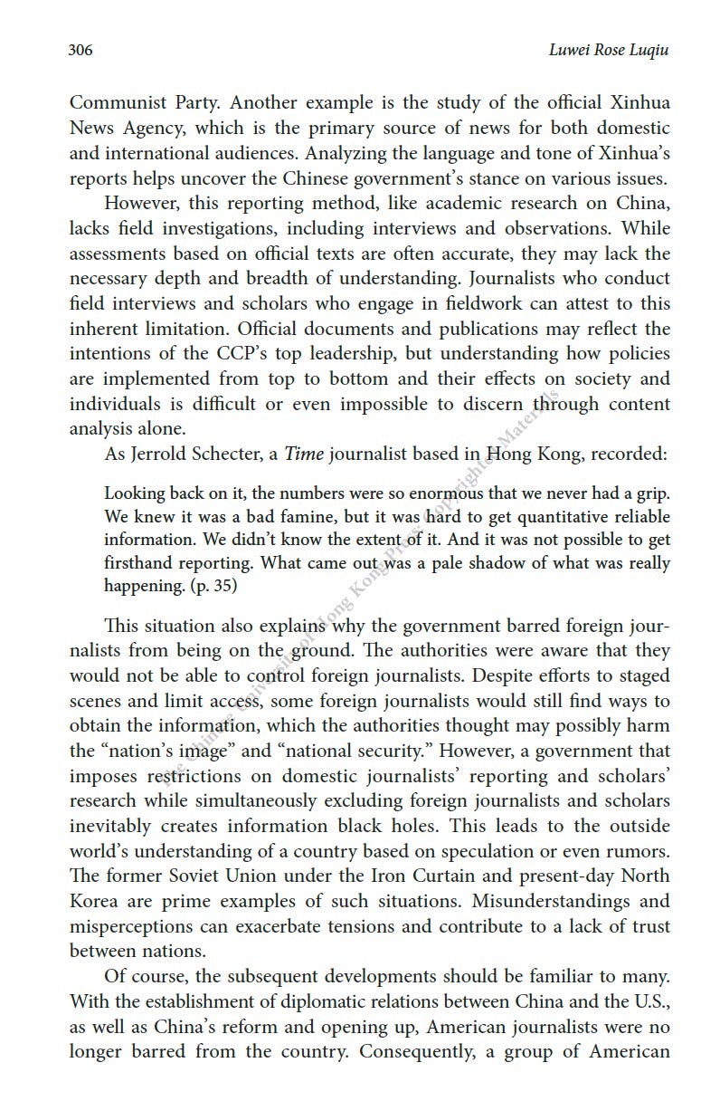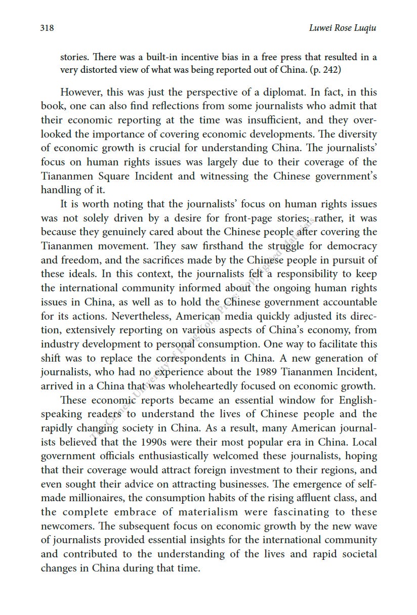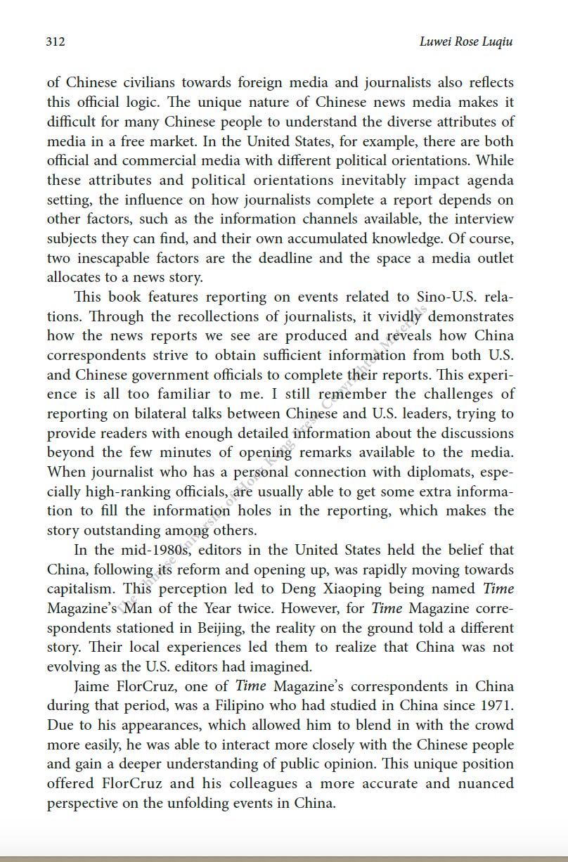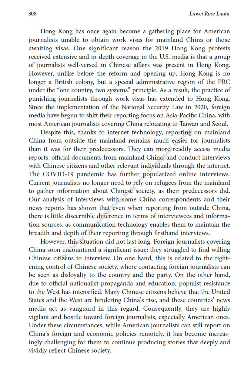 推薦一本書:美國駐華記者的口述歷史最近為China Review寫了一篇人生最長的書評,八千字。這本書是原CNN駐華記者Mike Chinoy花費了很長時間完成的一個project,採訪了超過一百名美國駐華記者,從採訪國共內戰的記者開始,一直到2021年採訪清零政策。其實我很羨慕他,可以有時間和精力完成這樣的一部口述歷史,因為不僅僅可以從講述中看中國的變化,也是美國新聞史研究的重要一手資料。閭丘露薇 Rose LuqiuSep 06, 2023171ShareThanks for reading 閭丘露薇’s Substack! Subscribe for free to receive new posts and support my work.Subscribe